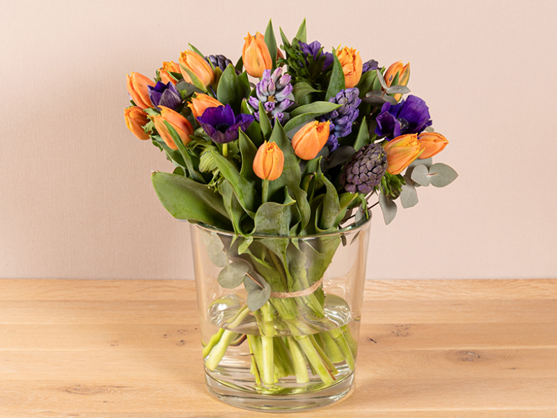 Rond paars/oranje boeket met echte voorjaarsbloemen, waaronder tulpen.